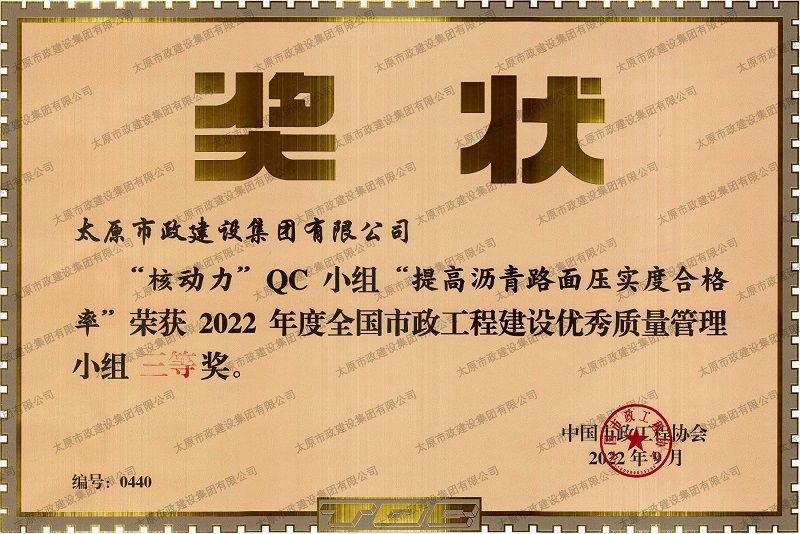 資質(zhì)證書 營業(yè)執(zhí)照 2022年度市政工程最高質(zhì)量水平評價_H5-1路道路及配套工程(二標(biāo)段) 2022年度工程建設(shè)誠信典型企業(yè) 中國施工企業(yè)管理協(xié)會_AAA級企業(yè)信用等級 2022年度全國市政工程建設(shè)優(yōu)秀質(zhì)量管理小組三等獎_''核動力QC小組”提高瀝青路面壓實度合格率”